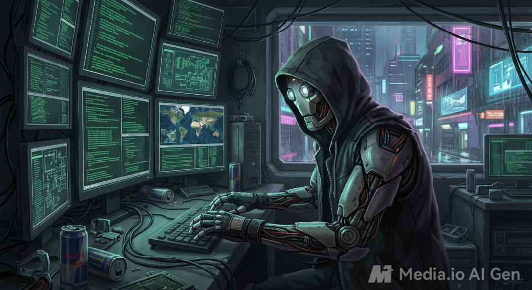 赛博朋克风格也没问题,比如身处未来高科技环境中的赛博朋克机器人黑客,正面对多块显示器进行操作。