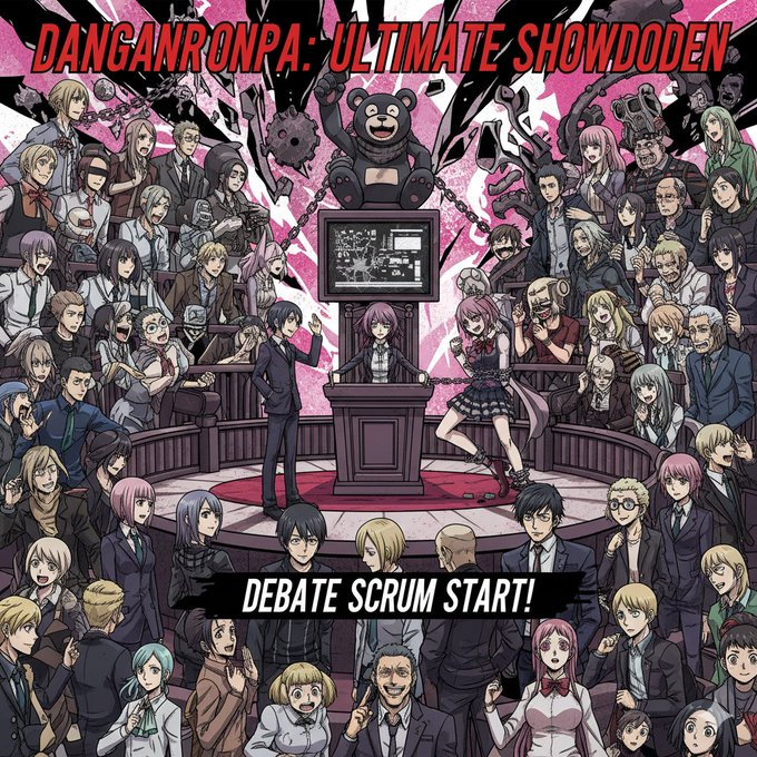 任务要求《弹丸论破系列》全体角色出庭的场景,保持官方风格的电影感插画。