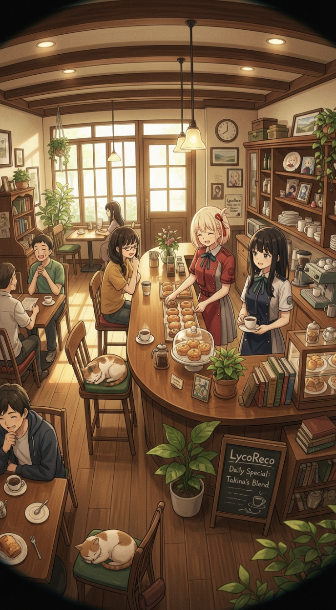 治愈系风格的多人场景,书架、手作甜点、黑板菜单、慵懒猫咪等,各种小细节让人着迷。