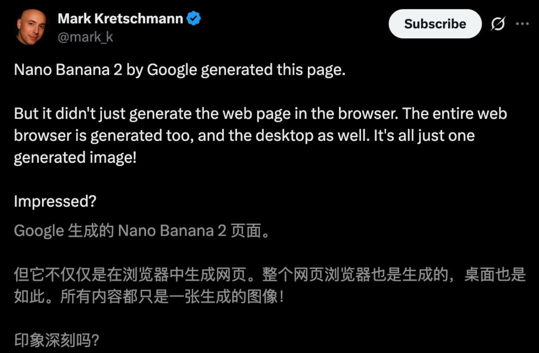 虽然不知道到底如何做到的,但他之前测试过Nano-banana 2,可以肯定的确是真的。