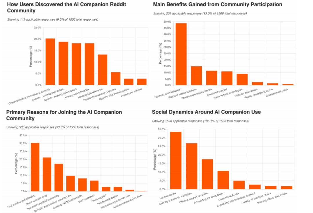 研究团队分析了1506条帖子,结果显示:只有6.5%的用户是主动来寻找AI伴侣,而10.2%的用户原本只是用AI来写东西、解难题,结果聊着聊着就变成了依赖。