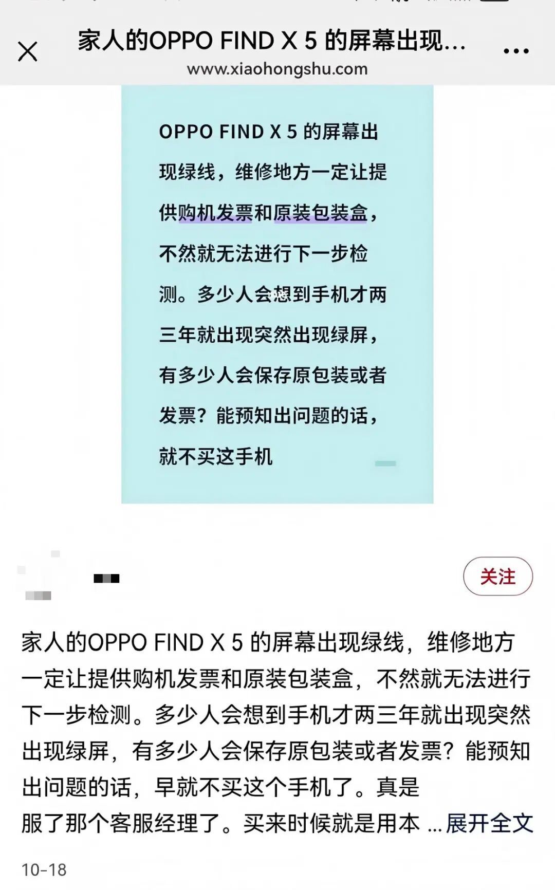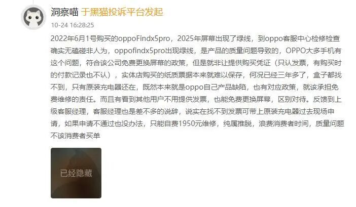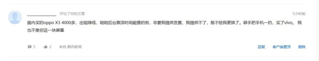 10月29日,前文推送评论区用户留言:在国内买的OPPO X3,出现绿线后被要求提供发票,提供不了就不更换。