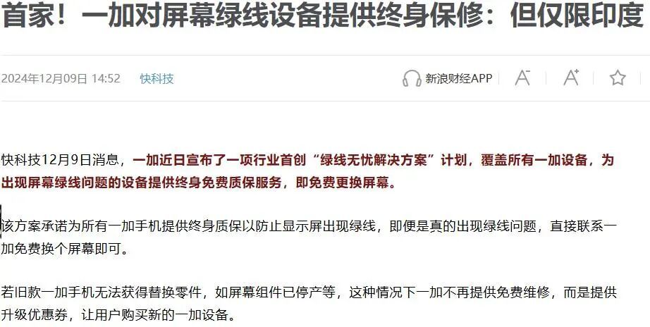 在“绿线门”爆发后,也有用户扒出2024年,海外市场的一加多个系列因采用三星E4屏幕,导致绿线事故频发,一加在印度推出了针对屏幕绿线问题的终身免费质保。“中外双标”触碰消费者的公平诉求底线,这也是舆情升级的诱因。