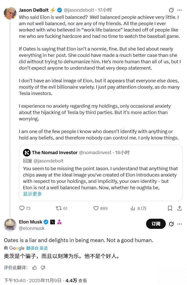 事情起因于一段帖文串:其中一位用户援引并赞赏马斯克对一名批评其薪酬方案的得克萨斯州参议员的回击言论。对此,欧茨回应道:“令人费解的是,马斯克发帖的内容从未体现他享受生活,甚至从未显露出他对绝大多数人所珍视事物的任何认知 —— 无论是朋友、家人、自然、宠物,还是电影、音乐或书籍。”