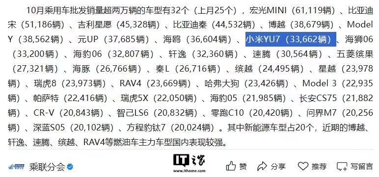 小米汽车官方并未公布具体的交付数据,不过在乘联分会今日公布的 2025 年 10 月份全国乘用车市场分析中,IT之家找到了其具体的销量情况,其中,小米汽车新能源乘用车零售 48654 辆、小米 YU7 车型批发销量超两万辆(33662 辆)。