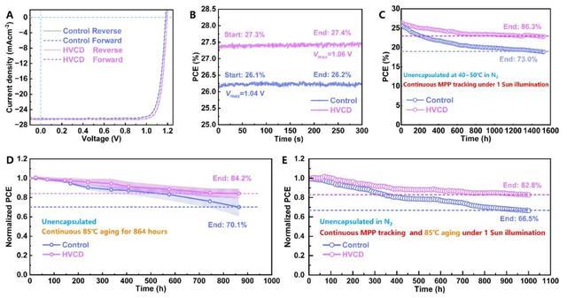 图 2、(A) 参考器件和氯均匀化器件在标准太阳光条件下的电流-电压曲线(正反向测量),(B)参考器件和氯均匀化器件稳态输出效率曲线,(C)参考器件和氯均匀化器件 1529 小时稳态输出效率曲线(40-50℃,1 个太阳光),(D)参考器件和氯均匀化器件在 85℃ 条件下老化的归一化效率变化情况,(E) 参考器件和氯均匀化器件在 1 个标准太阳光和 85℃ 耦合条件稳态输出归一化效率变化情况(用于热稳定性和加速老化测试的器件为非标准工艺制备)。