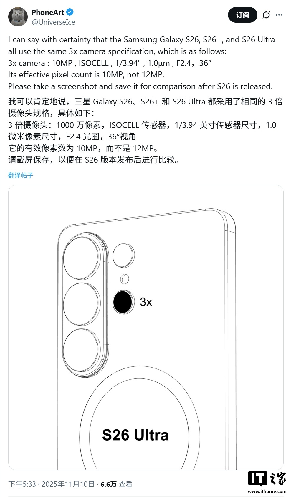 此外消息源还透露,Galaxy S26 Ultra 手机的 3X 镜头都是 1000 万像素,配备 ISOCELL CMOS 传感器,尺寸是 1/3.94 英寸,像素尺寸为 1.0 微米,光圈是 f/2.4,视角 36°。