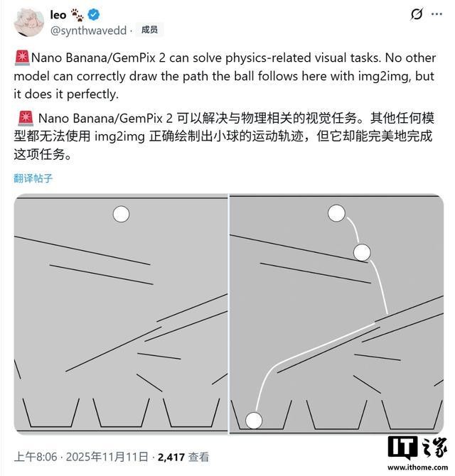 根据泄露的资料,Nano Banana 2 主要带来 2 项改进,其一是能够解决与物理逻辑相关的视觉任务。例如,在一张泄露的图片中,模型通过“图生图”(img2img)技术,准确绘制出了小球运动的物理轨迹,这是当前其他模型难以完成的复杂任务。