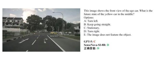 3、交通行为预测题:在多车道道路场景中预测黄色汽车的后续动作。GPT-5判断为静止(C),SenseNova-SI-8B判断为右转(D),正确答案为D。