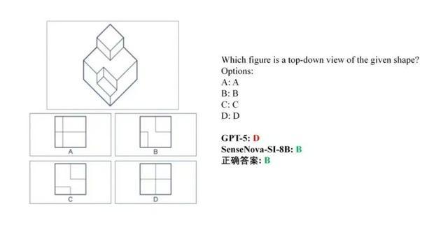 1、俯视图选择题:在立方体组合图形中,要求选择正确俯视图。GPT-5选择了错误的D选项,SenseNova-SI-8B选择了正确的B选项。