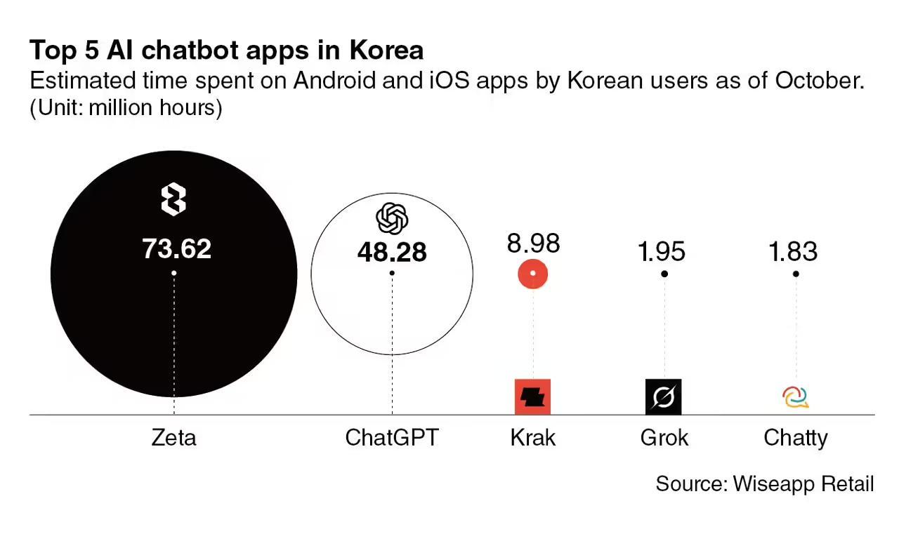 市场分析机构 Wiseapp Retail 依据韩国全国 5120 万 Android 与 iOS 用户的使用数据监测应用及支付趋势。其报告显示,Zeta 在今年 10 月累计实现用户互动时长达 7362 万小时,显著领先位居第二的 OpenAI 旗下 ChatGPT(4828 万小时)。