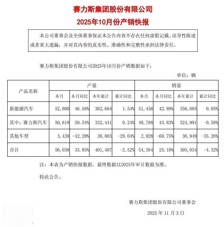 据IT之家了解,在刚刚过去的 10 月,赛力斯集团总产量达 56038 辆,同比增长 33.93%;销量 54384 辆,同比增长 25.10%。赛力斯新能源汽车产量 52600 辆,同比增长 46.58%;销量 51456 辆,同比增长 42.89%。其中,赛力斯(品牌)汽车 10 月产量 50619 辆,同比增长 50.54%;销量 48788 辆,同比增长 43.83%。其他车型产量和销量均出现下滑。