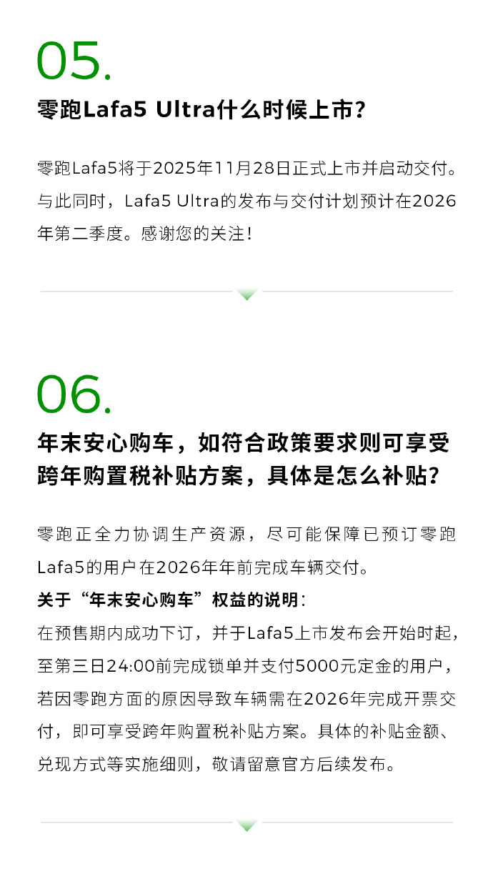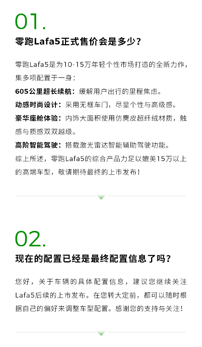 凤凰网科技讯 11月12日,针对零跑Lafa5目标用户关心的价格问题以及Ultra版上市时间等相关问题,零跑官方在新一期的预售期答网友问中回应称:零跑Lafa5是为10-15万年轻个性市场打造的新产品,采用无框车门设计,并搭载激光雷达智能辅助驾驶功能,续航达到605公里,综合产品力媲美15万以上的高端车型。