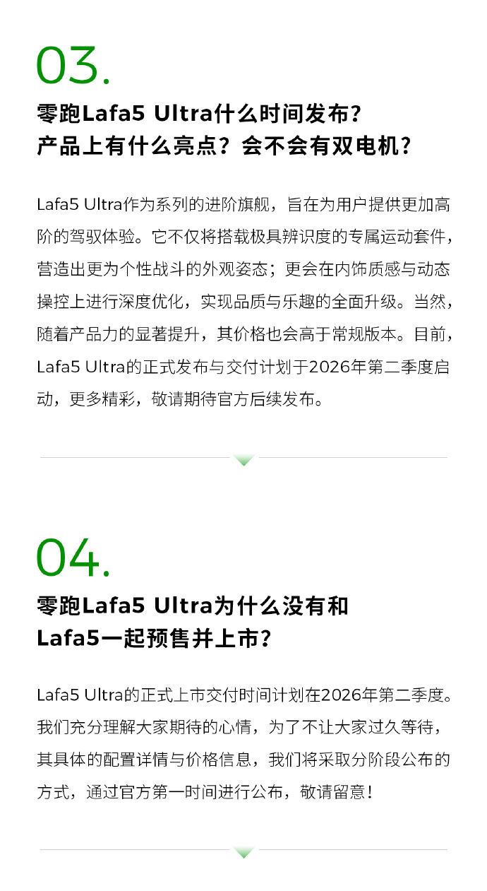 此外,Lafa5 Ultra将搭载专属运动套件,内饰质感与动态操控上也进行了深度优化。目前,Lafa5 Ultra的正式发布与交付计划于2026年第二季度启动,具体的配置详情与价格信息将采取分阶段公布的方式,通过官方第一时间进行公布。