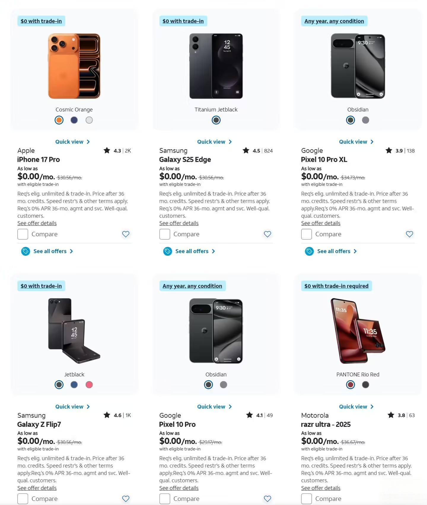 IT之家 11 月 12 日消息,据科技媒体 Phone Arena 今天报道,每年各大手机厂商推出新旗舰机时,Verizon、AT&T、T-Mobile 等美国运营商都会纷纷推出促销广告:“免费拿新手机,我们请客”,但这些广告里通常还会有一行小字说明条款,表明手机的实际费用会被分摊在每月的话费中。