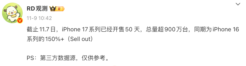 截至上周,iPhone 17 系列的国内总销量已经正式突破了 900 万台,对比同期的 iPhone 16 系列涨幅超过 50%。
