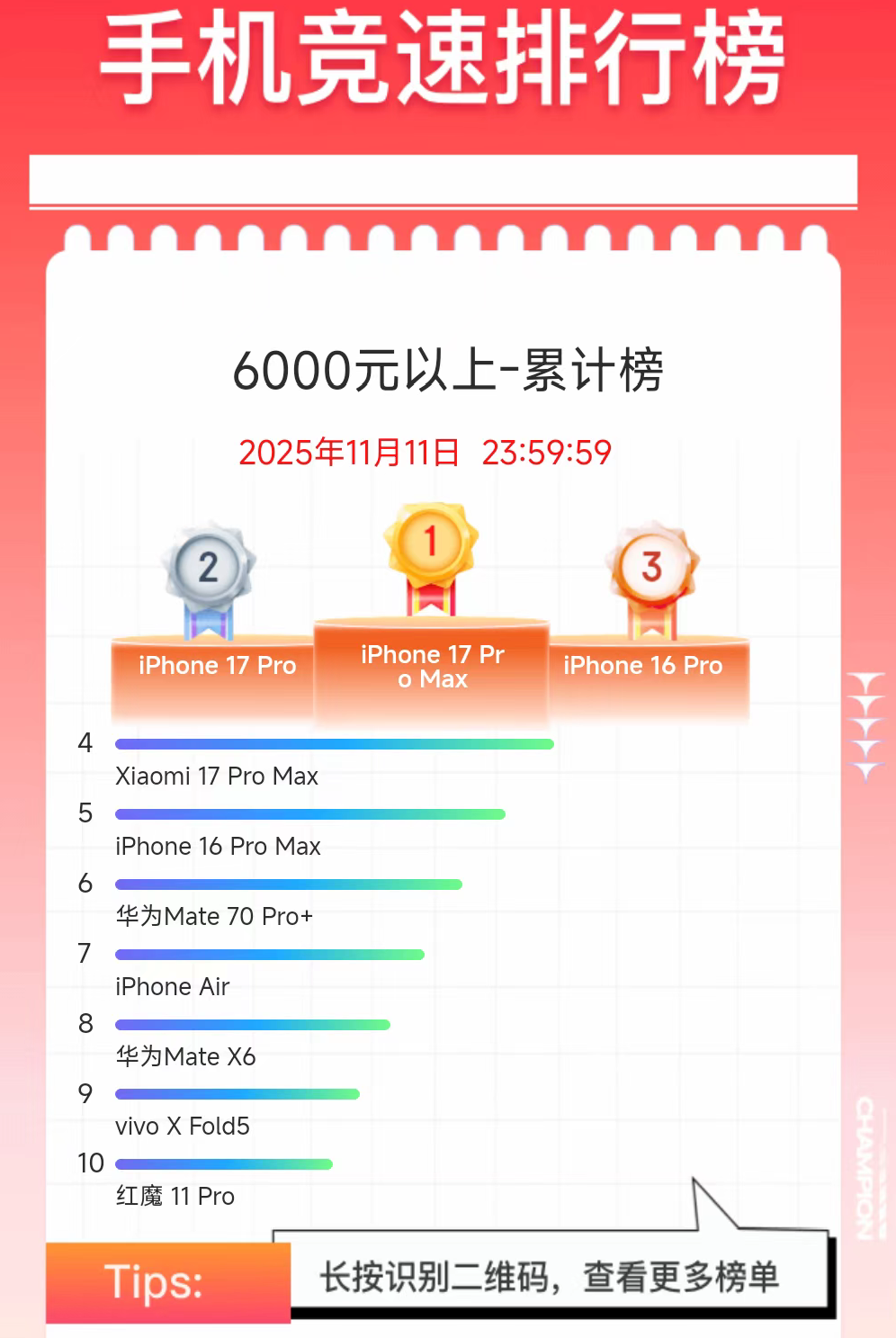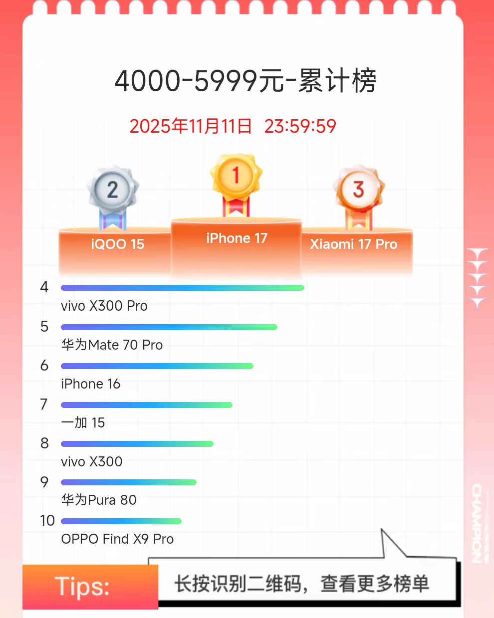 包括在 4000-5999 元榜单里,小米 17 Pro 也排到了第三的位置。