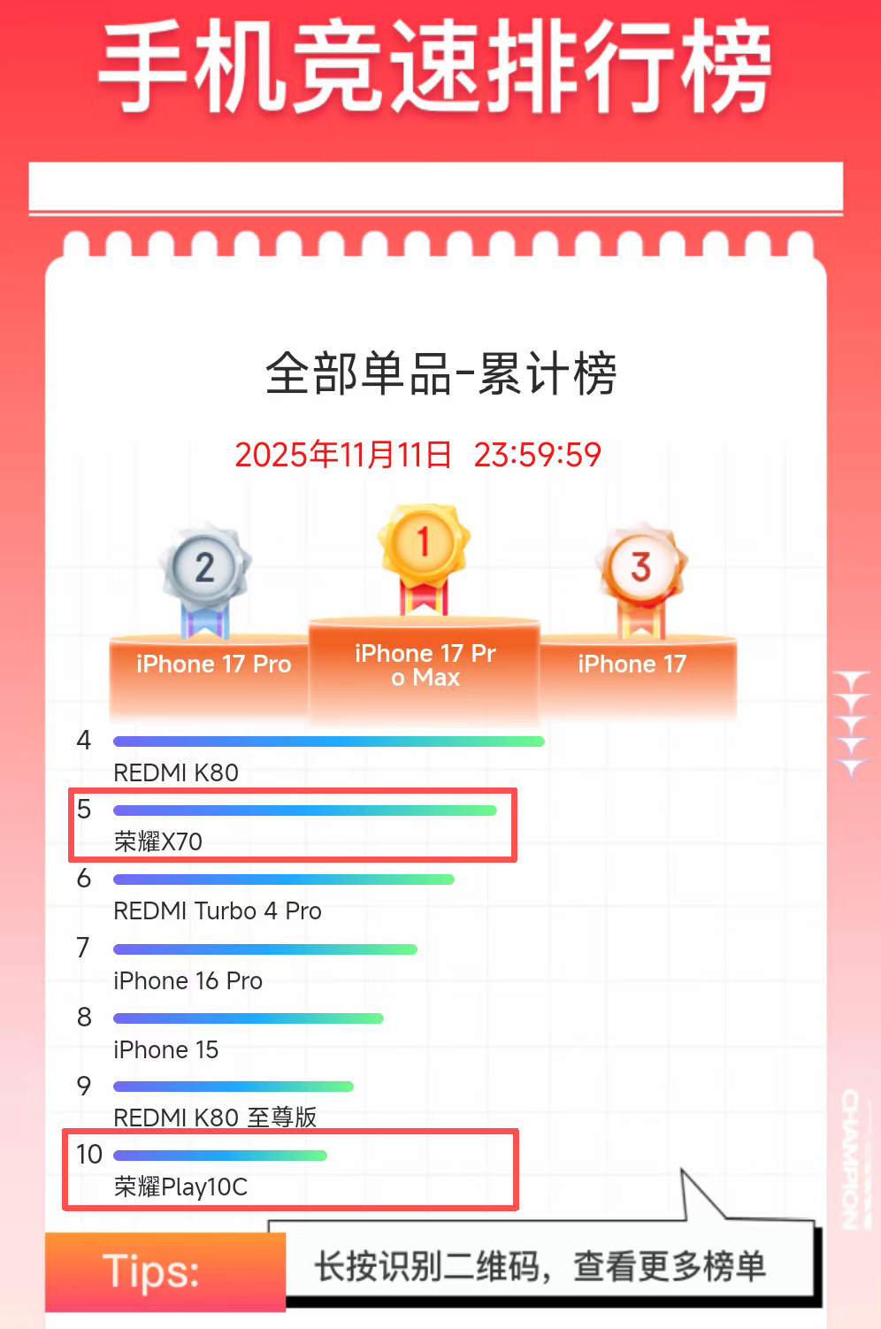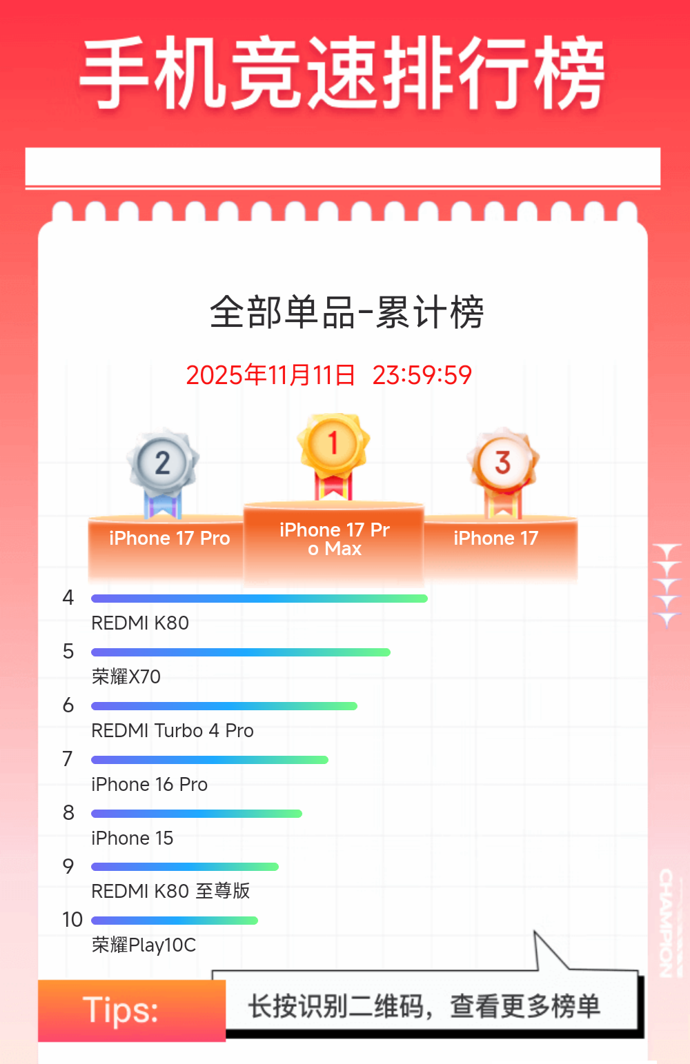 其中,曾在 618 就拿下安卓冠军的 REDMI K80,这次继续蝉联,总排名仅次于果子的 iPhone 17 三兄弟。