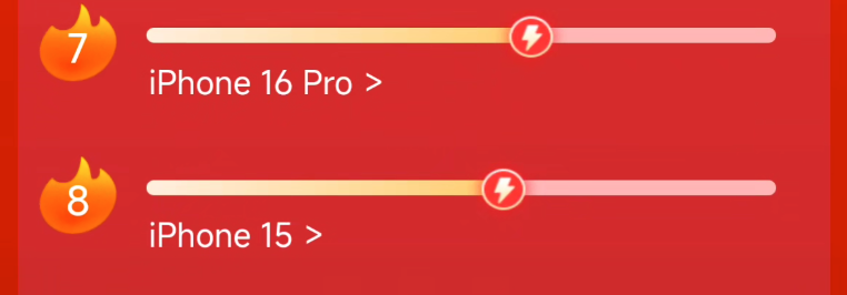 降价到 5000 多的 iPhone 16 Pro 和降到 3000 多的 iPhone 15,也分别排到第 7 和第 8 名。
