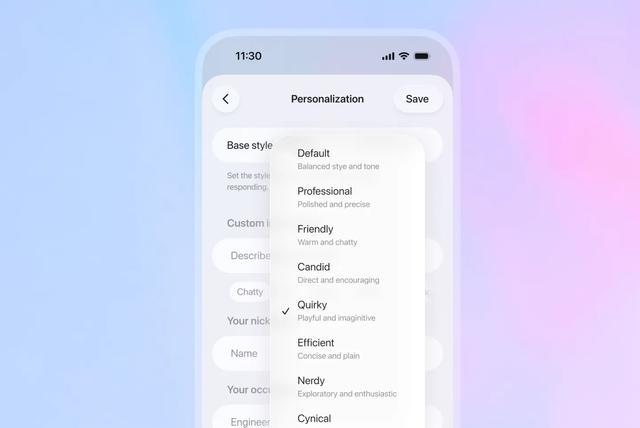 此次更新的另一大亮点,是OpenAI极大丰富了对话风格“个性预设”选项,用户如今可在“默认、专业、友好、坦率、古怪、高效、书呆子和愤世嫉俗”等多种个性之间灵活切换。OpenAI还宣布将试验允许部分用户直接在设置中微调ChatGPT的语言风格。