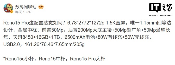 IT之家 11 月 13 日消息,OPPO Reno15 系列手机将于 11 月 17 日 19:00 发布,博主 @数码闲聊站 昨日曝光了 Pro 版新机的部分规格。