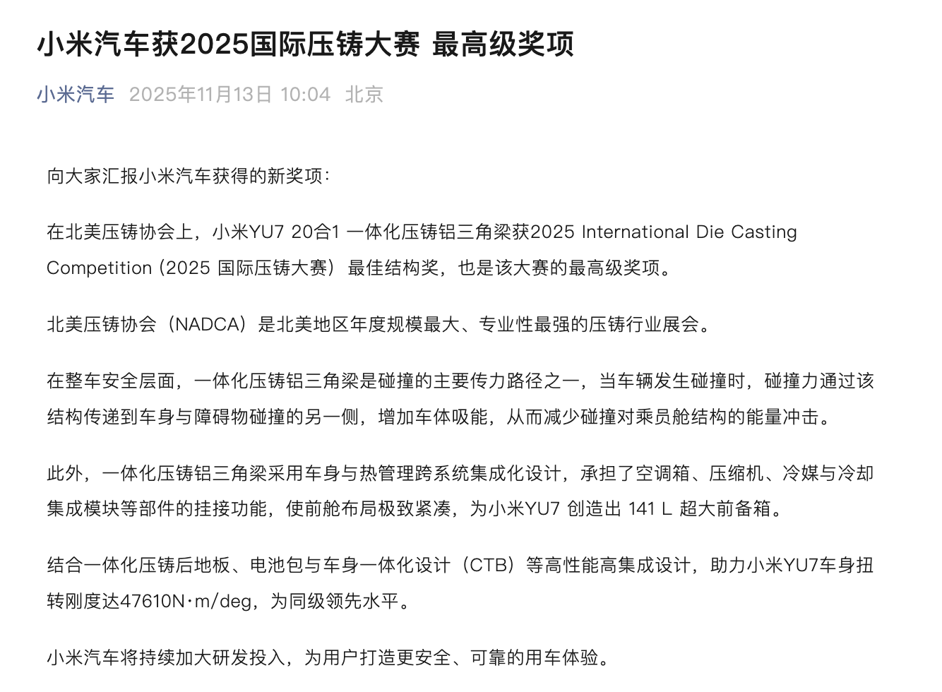 北美压铸大赛揭晓:小米YU7斩获“最佳结构奖” 凤凰网科技讯,11月13日,小米汽车发文称,在北美压铸协会上,小米YU7 20合1一体化压铸铝三角梁获2025国际压铸大赛最佳结构奖,也是该大赛的最高级奖项。北美压铸协会(NADCA)是北美地区年度规模最大、专业性最强的压铸行业展会。 据介绍,在整车安全层面,一体化压铸铝三角梁是碰撞的主要传力路径之一,当车辆发生碰撞时,碰撞力通过该结构传递到车身与障碍物碰撞的另一侧,增加车体吸能,从而减少碰撞对乘员舱结构的能量冲击。 Published by 风君子 独自遨游何稽首 揭天掀地慰生平 View all posts by 风君子