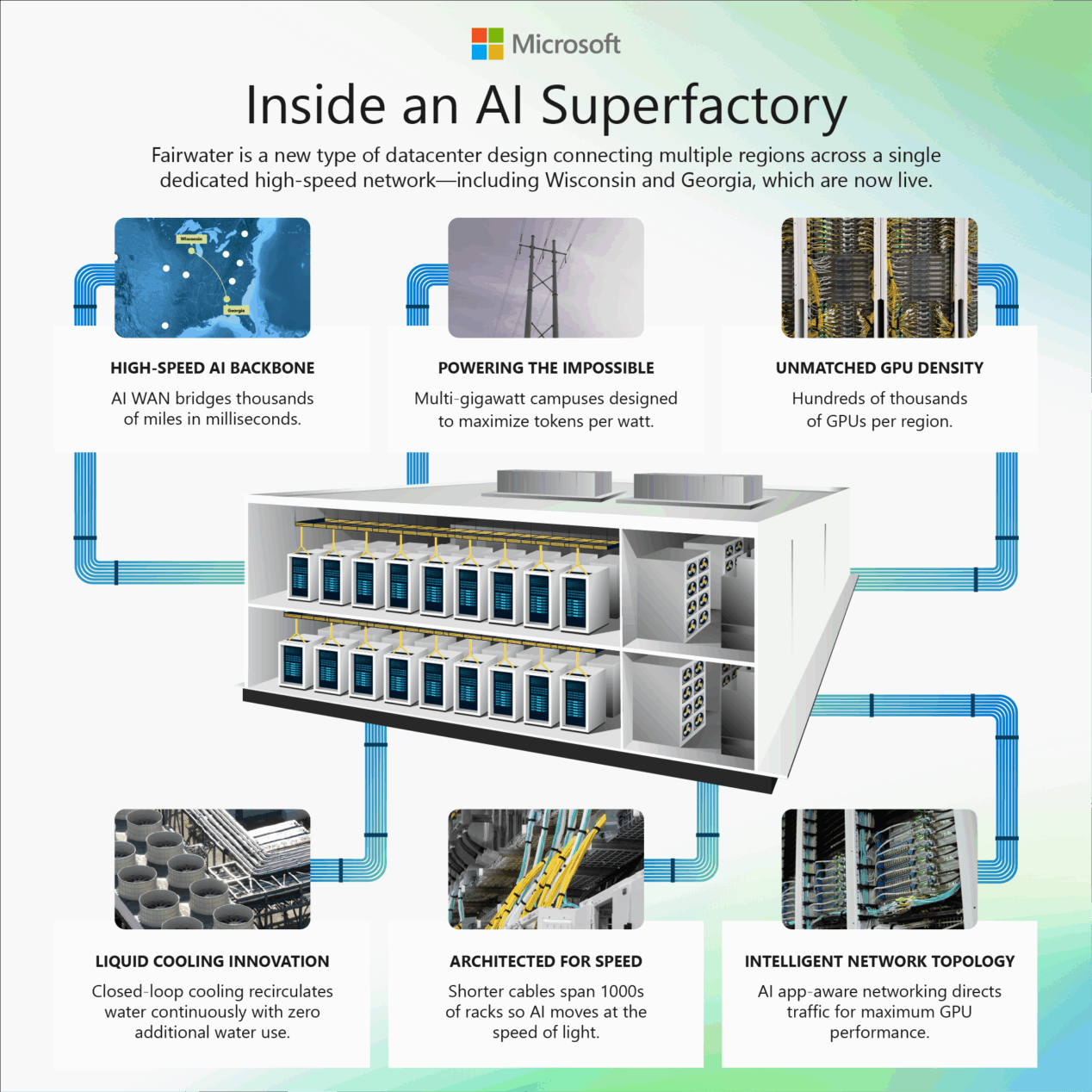微软目前已投运第二座采用 Fairwater 架构设计的数据中心,分别位于威斯康星州 Mt Pleasant 和佐治亚州亚特兰大。两者均采用双层设计,配备英伟达 GB200 NVL72 机架,拥有近乎 0 用水量的液冷冷却系统。