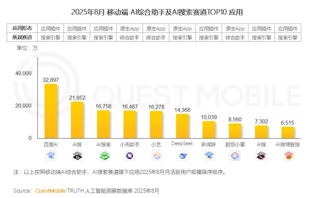 搜索业务最为典型。2025年7月,百度搜索全新改版,将传统搜索框升级为支持超千字文本、多模态输入的“智能框”,搜索工具由此变成了直接提供答案和解决方案的智能决策中心。据调研机构QuestMobile数据,2025年8月,百度AI以3.29亿月活(MAU)用户规模,位列国内移动端AI综合助手及AI搜索赛道第一。