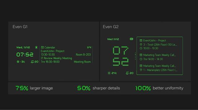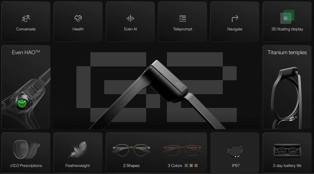 Even G1内置Micro LED显示器与光波导镜片的光学方案,分辨率为640×200,最大亮度为1000nit,视场角为25度,刷新率为20Hz,能实现提词器、导航、实时翻译等功能,还具备镜腿交互功能,能完成AI助手、快速语音笔记等功能,支持定制镜片。