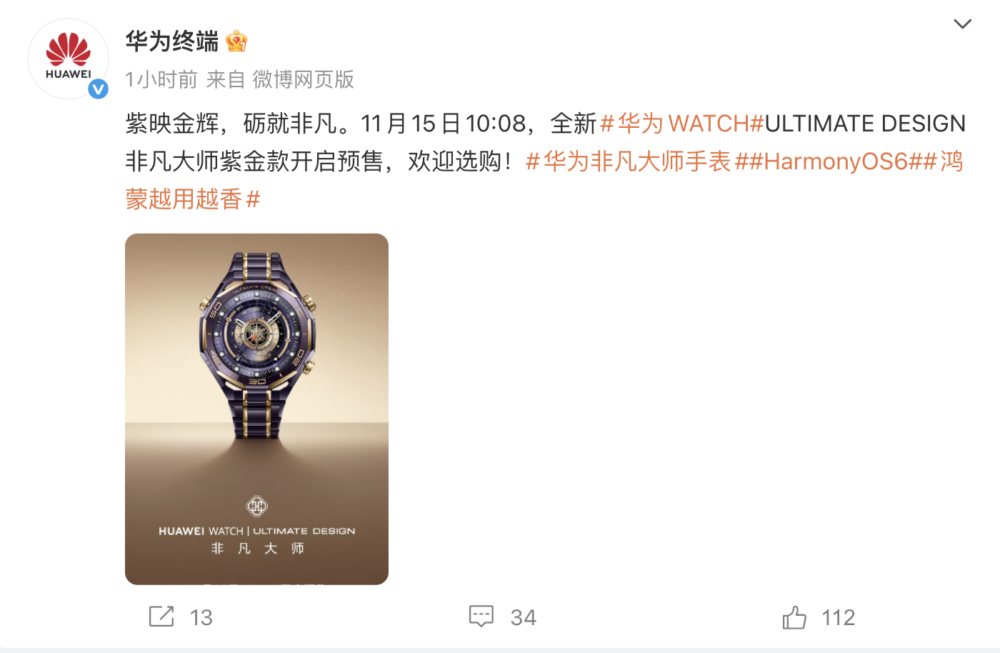凤凰网科技讯(作者杨睿琪/云飞) 11月14日,华为官方宣布,11月15日10:08,全新华为WATCH ULTIMATE DESIGN非凡大师紫金款开启预售。从预热海报来看,华为新款智能金表将采用紫金配色,延续了该系列超高端产品的设计风格。