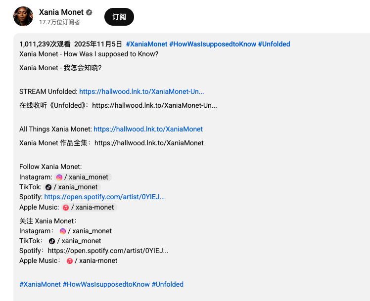 其中一位 AI 歌手,Xania Monet ,出道两三个月,发过的歌却个个受欢迎。最新的《How Was I supoosed to Know?》在油管直接是百万播放量,这还没算 Tiktok 和 Instagram 的数据。