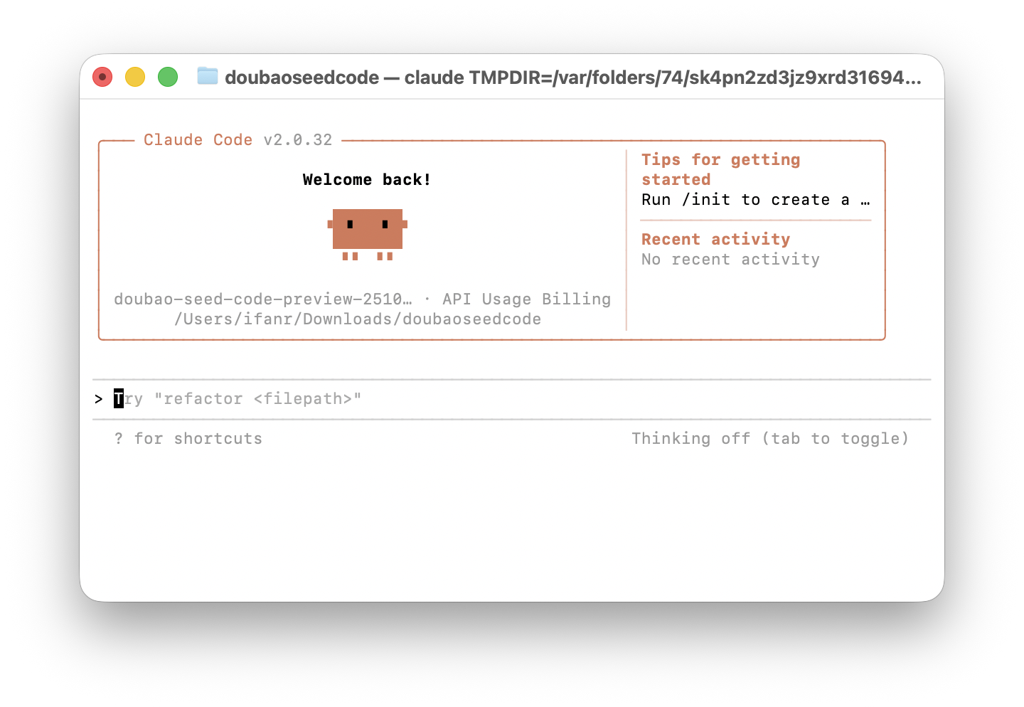 简单配置之后,我们就可以进入到 Claude Code 的页面,并且显示当前的模型时 doubao-sseed-code-preview-251028。