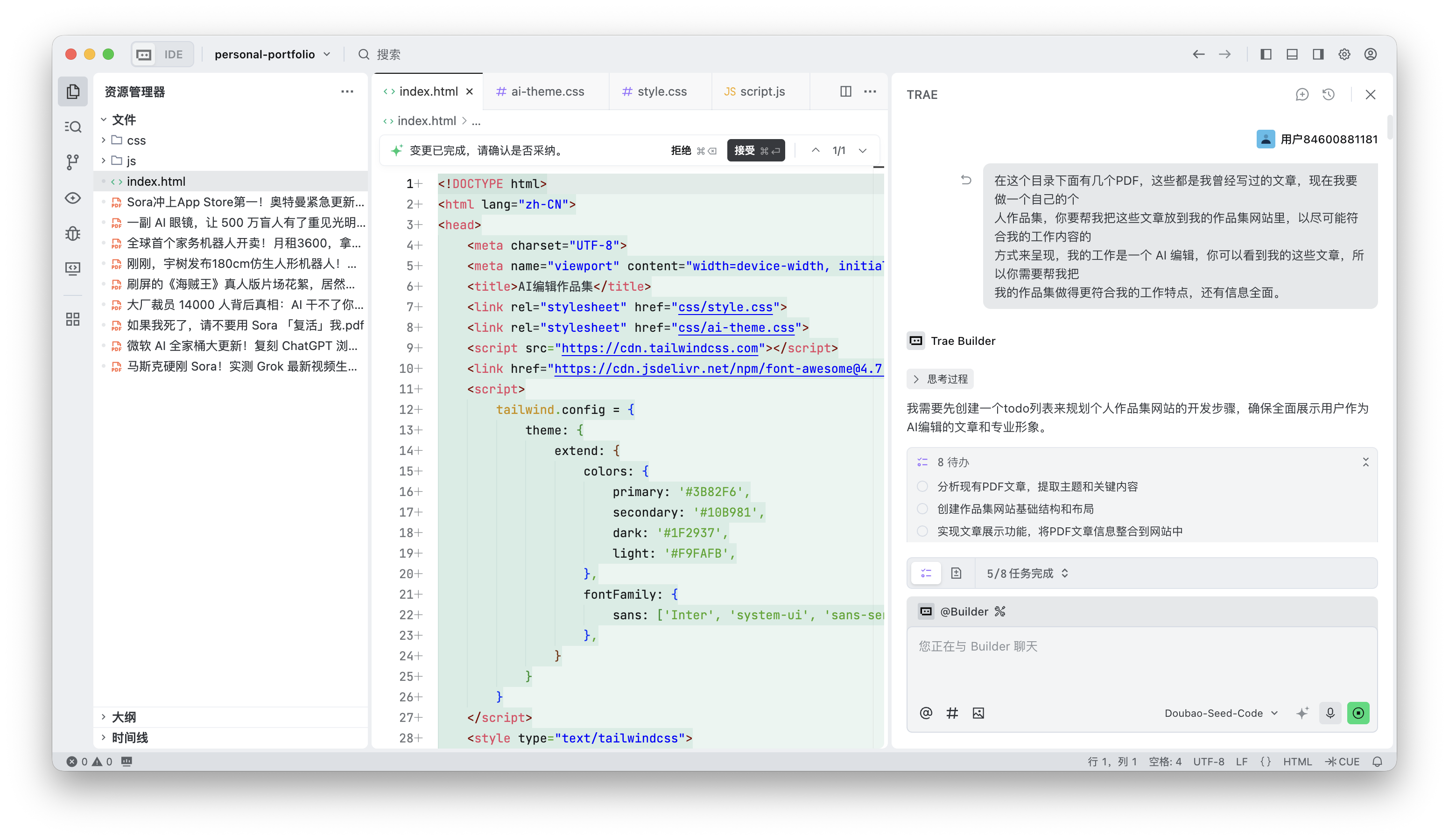 和网页版处理不同,在本地使用,意味着我们的主动权更大。我们直接把过去几篇 APPSO 的文章放到项目文件夹,然后在 TRAE 里和模型对话,要它根据这些文件,帮我制作个人作品集。