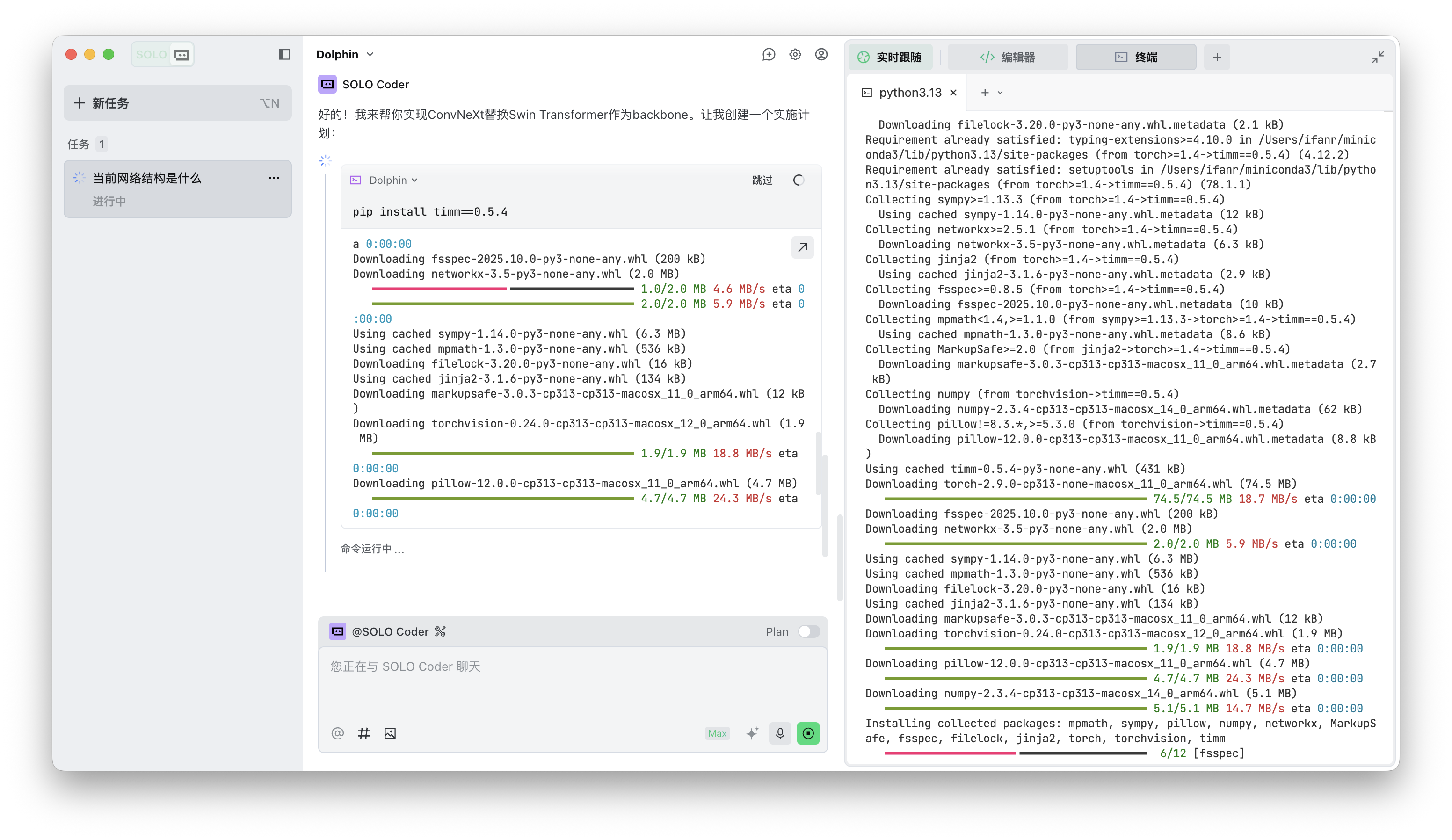 ▲ 指令下达后,直接开始执行,帮我完成各种包的安装,实时跟随会自动切换不同的工具面板。