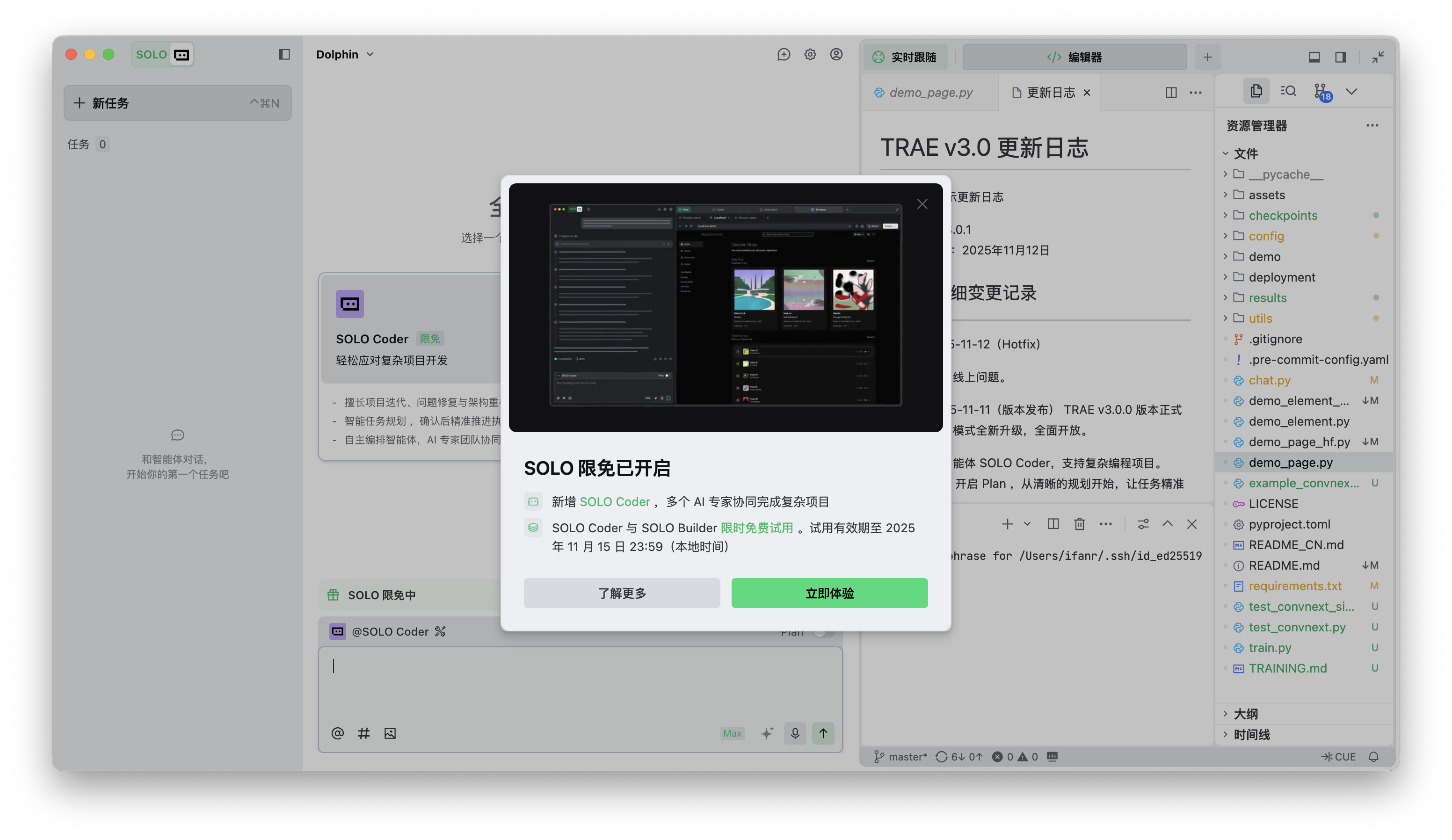 这两个 SOLO 智能体,把过去传统软件开发,涉及到的全部工作基本都包揽了。目前 SOLO 模式正在限免期,前往 trae.ai 下载安装,登录之后就能免费体验到 15 号。