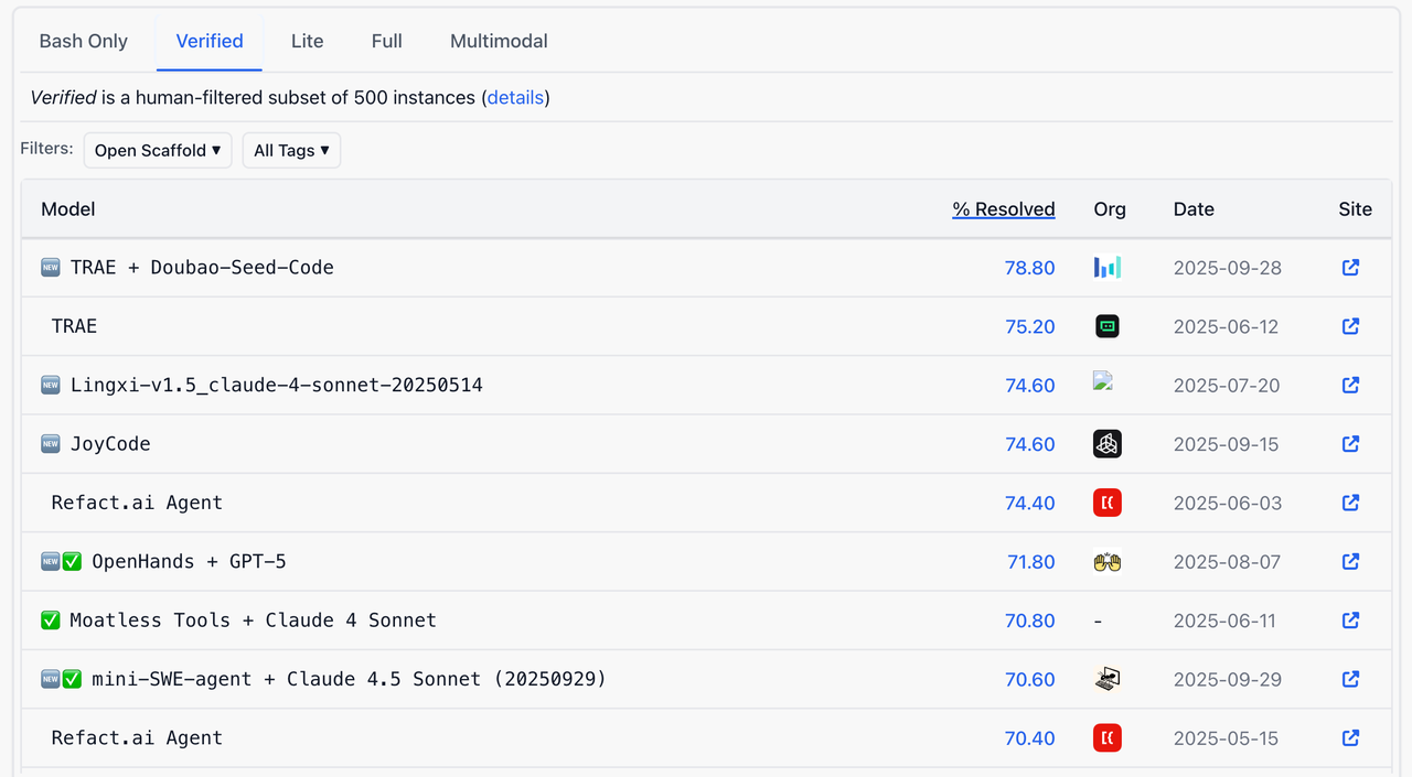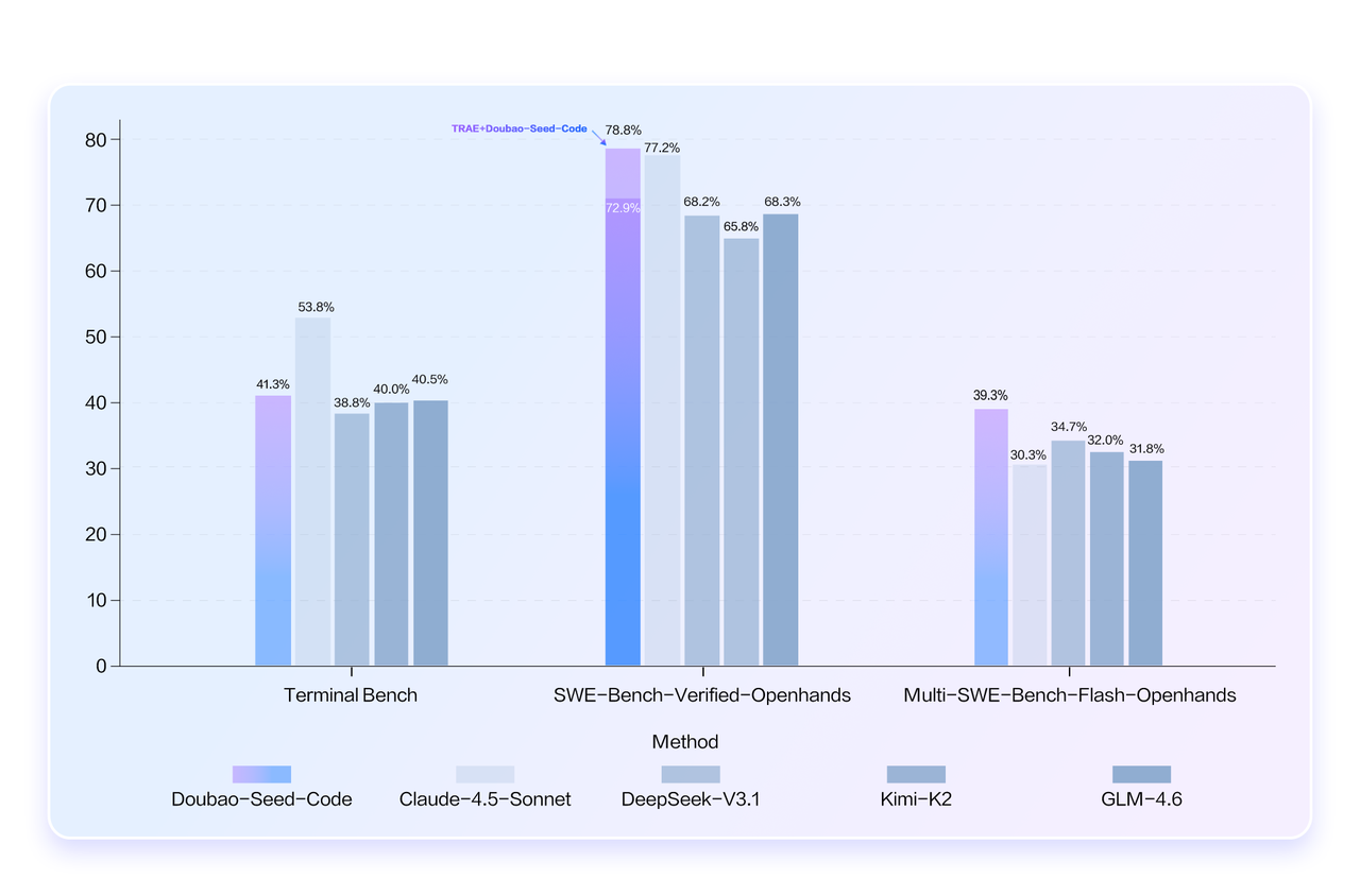 字节也专门为 Doubao-Seed-Code 在 TRAE 中的表现进行过优化,与 TRAE 深度结合的豆包编程模型,在对应的编程基准测试中,甚至拿到了超过 Claude 4.5 Sonnet 的成绩。