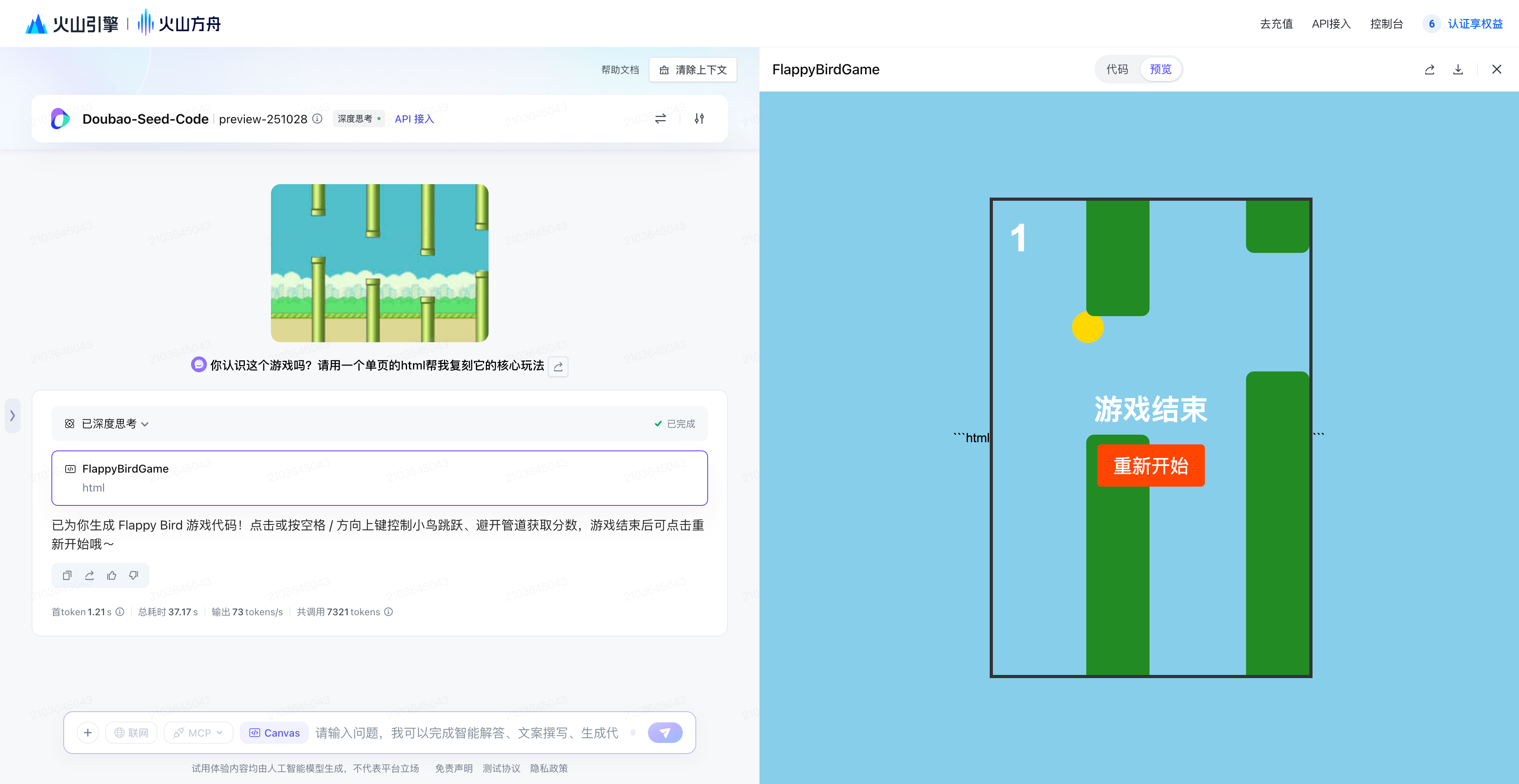 ▲ https://www.volcengine.com/experience/ark?model=doubao-seed-code-preview-251028