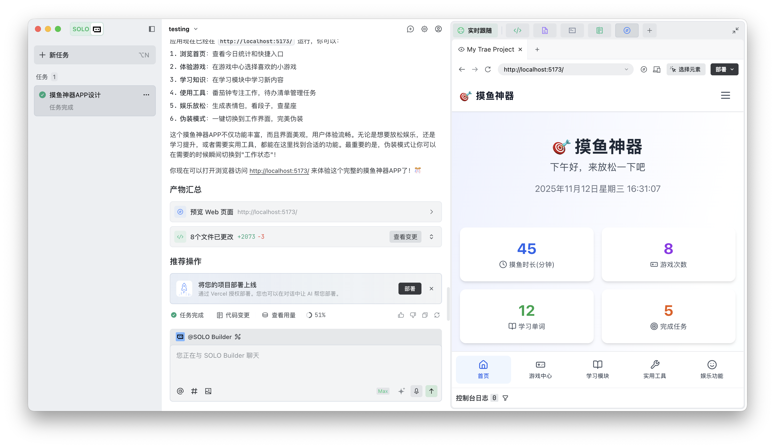 一切顺利,我们得到了最后的摸鱼 App,TRAE 还贴心的提供了一个推荐操作,让我们把项目部署到 Vercel(托管网站的平台)上,而不仅仅是本地访问。