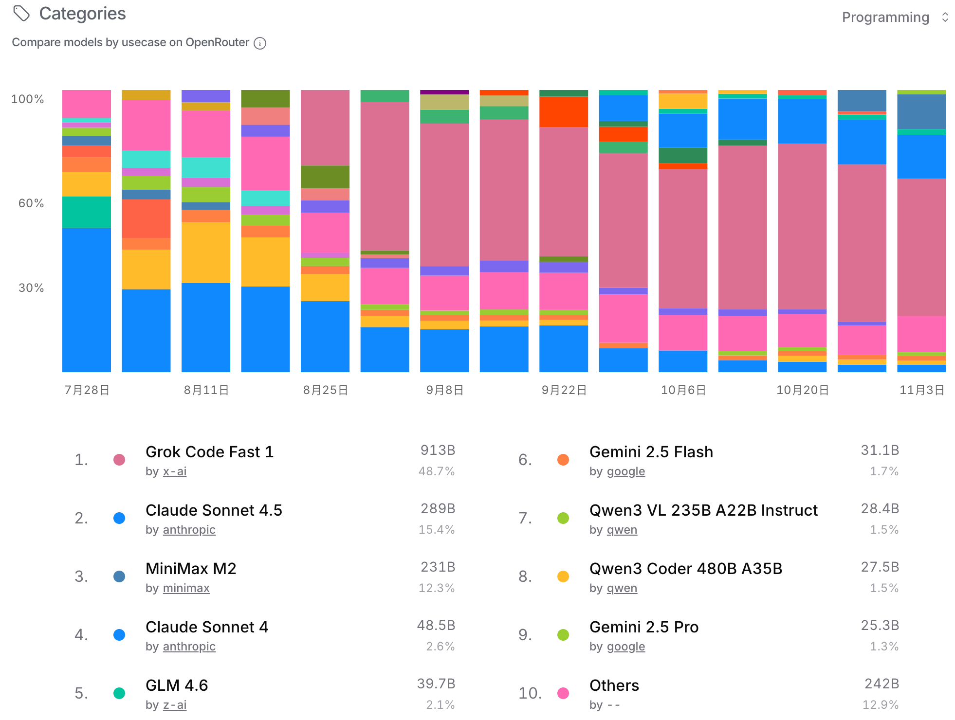 到了今年这个时候,Claude 断供看起来反而是倒逼了我们一把。国产的编程模型有了智谱的 GLM 4.6、阿里的 Qwen Coder、Minimax M2、月之暗面的 Kimi K2 Thinking,个个都榜上有名;今天又多了一个选择,Doubao-Seed-Code。
