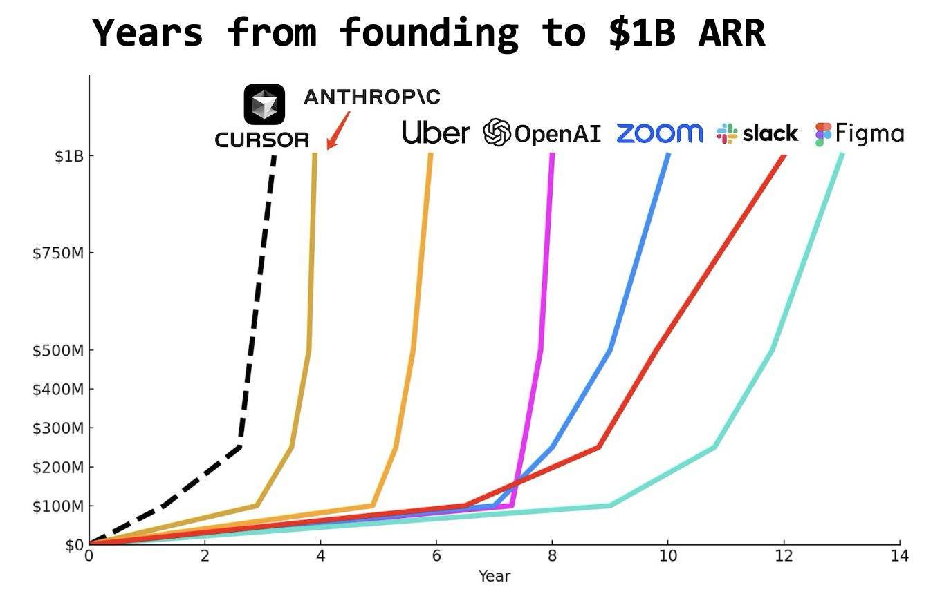 有多热,代表性产品 Cursor 在最新一轮融资后,估值来到了 300 亿美元,并且它几乎可以确认,将是历史上最快达到 10 亿美元 ARR 的公司。