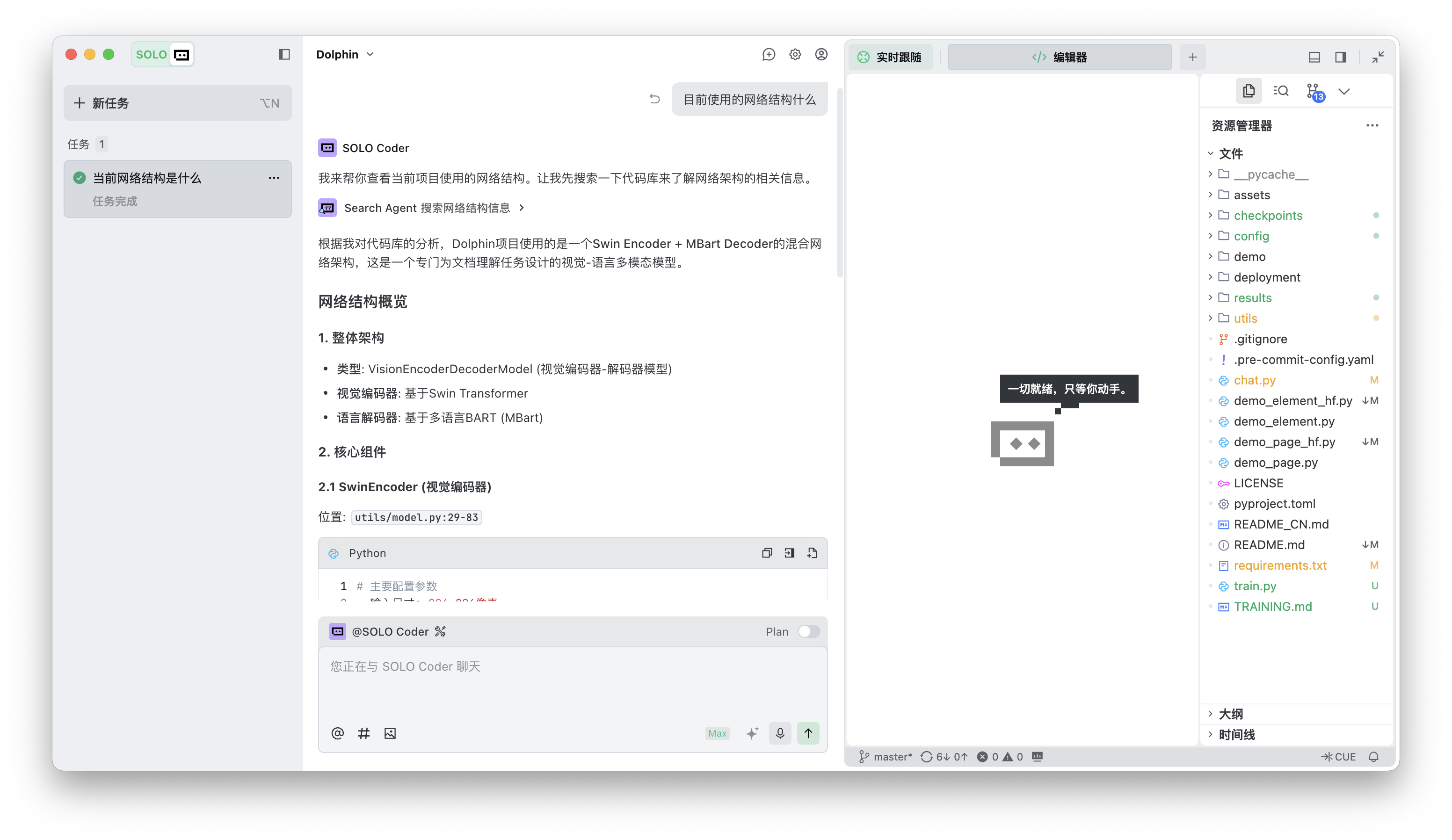 但现在,TRAE SOLO 模式改变了过去传统的开发工具、或者 AI 聊天编程产品的形态。它整体的布局更像一个大模型助手的智能体界面,没有了中间的代码编辑器,最左边也不是文件管理器,而变成了任务列表。
