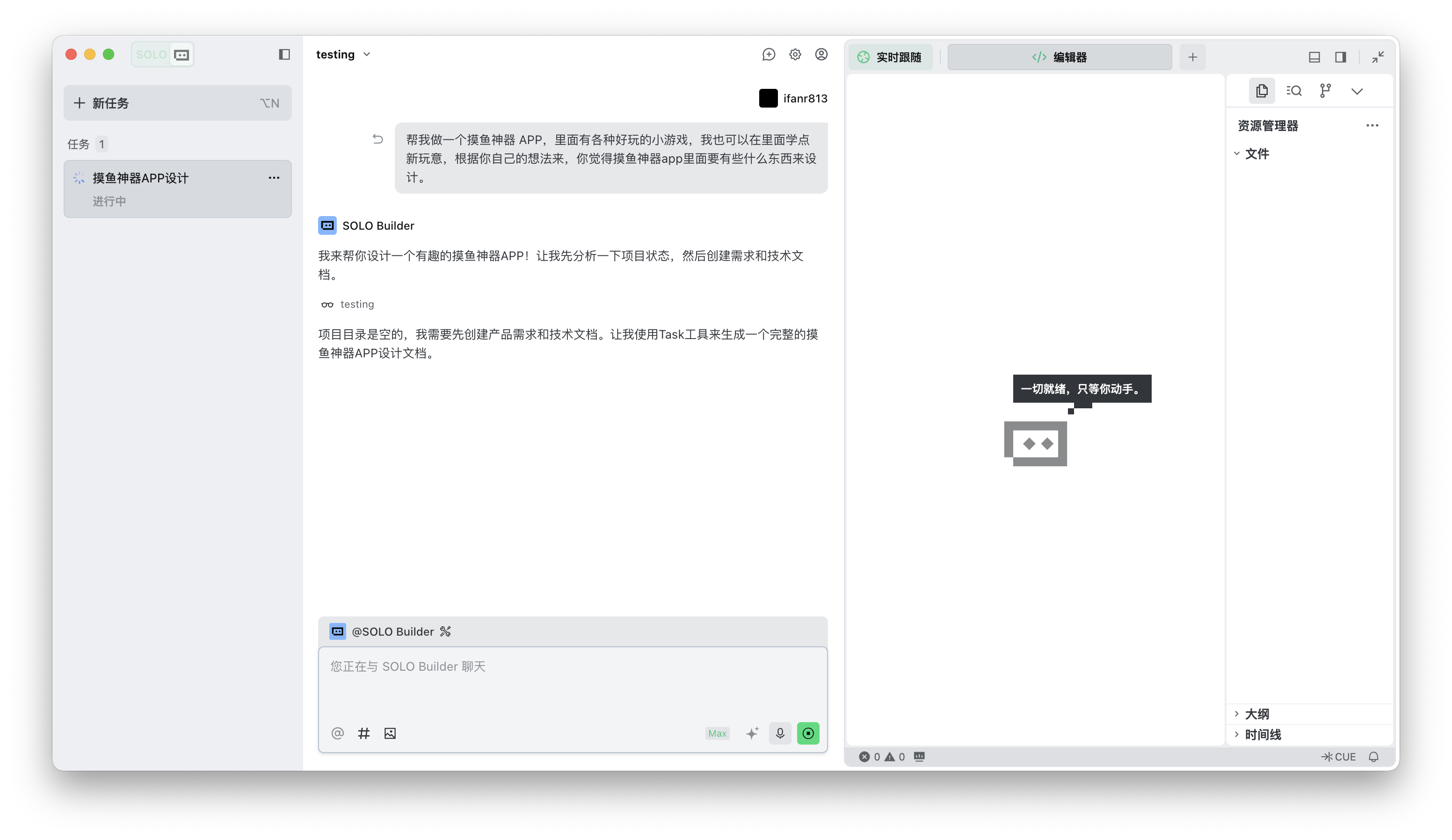 我们输入了一个需求,是让它做一个摸鱼 APP。得到了对应的文档之后,SOLO Builder 不会立刻执行,而是让我们先确认这个计划是否可行。此刻我们就是项目经理,告诉 AI 来 Align(对齐)一下颗粒度,不行就要 AI 再回去修改文档。