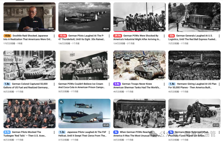 第一个案例来自WW2 Tales ,一位 AI课程讲师帮学生用 AI 复活了这个已经被放弃的频道。频道主讲二战战俘,主题冷门、画面简陋,却在复活后一个月就赚了11万美金。
