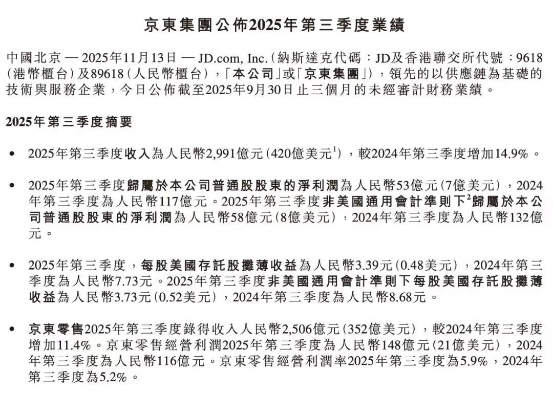 这一趋势已在京东的财报中得到印证。三季度,京东集团收入为2,991亿元人民币(约420亿美元),同比增长14.9%。