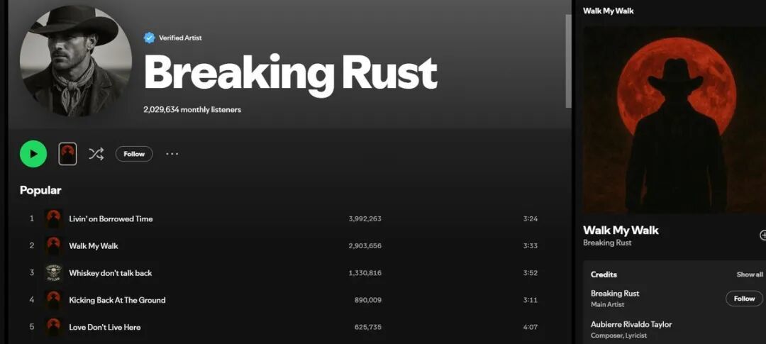 权威音乐榜单 Billboard 旗下的乡村音乐排名榜,最新首位《Walk My Walk》,是一首 AI 生成的歌曲作品,Breaking Rust 自然也是一位 AI 歌手。从数据来看,它不仅登顶了,还连续在榜了三周。对于任何一个新人来说,都是堪称「爆」了的成绩。