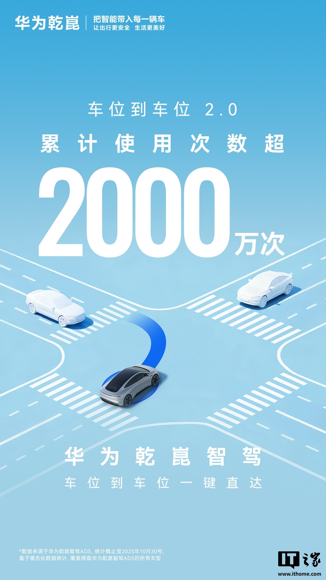 据IT之家此前报道,华为在 11 月 14 日宣布,乾崑智驾 ADS 车位到车位领航辅助 2.0,累计使用次数已突破 2000 万次。今年 10 月,华为乾崑辅助驾驶里程新增 6.81 亿公里,辅助驾驶活跃用户占比 95.2%,车位到车位 2.0 使用 434 万次。截至目前,华为乾崑辅助驾驶里程累计已达 58.11 亿公里。