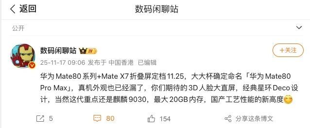 从余承东的微博可以看到,他的微博机型小尾巴已经变成「Mate 80 Pro Max」,基本证实了此前网传的「加大杯」「Pro+」改名为「Pro Max」的情况。