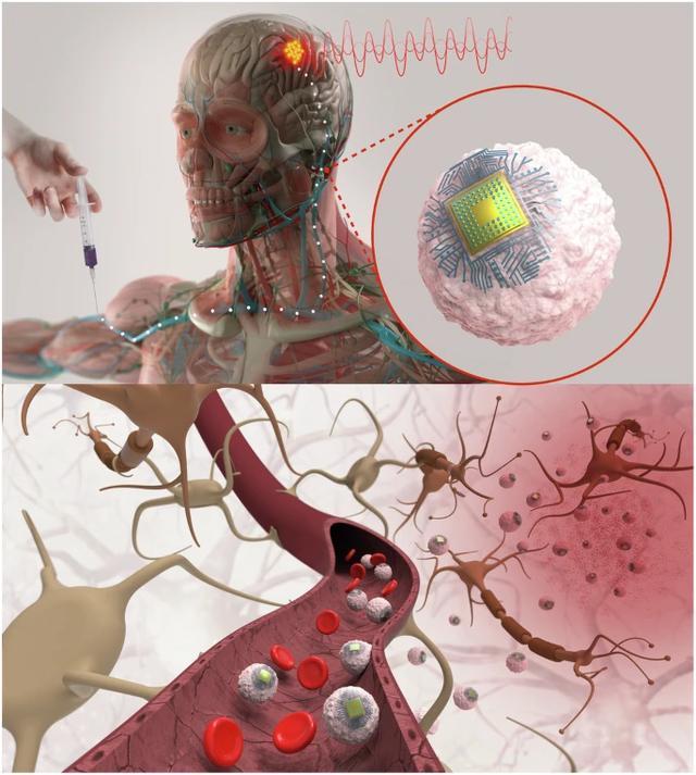 Circulatronics 系统的核心是可注射的、微小的无线电子设备群体 ——SWEDs(亚细胞大小的无线电子设备)。这些设备能够通过注入血液后,进入大脑的炎症区域。它们通过与名为单核细胞的免疫细胞融合,形成一种“细胞机器人”。