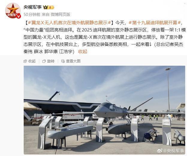IT之家 11 月 17 日消息,据央视军事报道,今天,第十九届迪拜航展开幕,“中国力量”亮相迪拜。在 2025 迪拜航展的室外静态展示区,停放着一架 1:1 模型的翼龙-X 无人机,这也是翼龙-X 首次在境外航展上进行静态展示。
