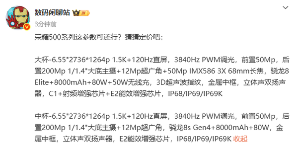 【CNMO科技消息】11月17日,有业内人士透露了即将于11月24日正式发布的荣耀500系列详细配置参数。该系列包含荣耀500与荣耀500 Pro两款机型,均主打高性能、高续航与旗舰级影像体验。